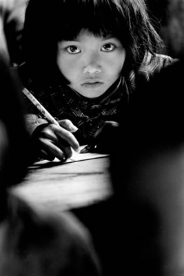Su Mingjuan sat in the second row, and Xie Mingjuan had to shoot through the gap between the two children in the first row. The morning light shone through the classroom window and lit up her face. The photographer quickly switched to a 80-200mm lens and held his camera steady and waited in front of the classroom. When she raised her head again while holding her pen in hand, he pressed the shutter. At that instant, he felt the elation of creative work: the elation from being able to seize the composition, the moment and the light. He took two of these photos, one landscape and one portrait. The portrait photo was the one that achieved immortality.