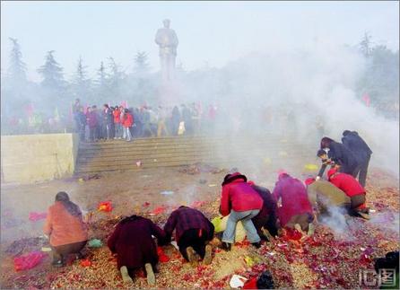 距毛澤東銅像廣場老遠,便聽到鞭炮聲像炒豆子一樣,劈哩啪啦響個不停,巍峨屹立的毛澤東銅像籠在一片煙霧之中,但見銅像前黑壓壓跪著一大群人,或秉蠟磕頭,或持香作揖,一個個十分虔誠。其中一位長者表示,他希望毛爹爹保佑自己的孫子考上名牌大學。而在廣場附近,小販們則伸長脖子,高一聲低一聲地吆喝著:「給毛爹爹拜年,香燭優惠啦!」