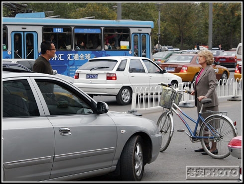 At around 8:50am on October 20, 2006, on the road from the Zhaoyang East bridge towards the Blue Island Building, a funny episode occurred: a foreigner acted as traffic police and made a small sedan which had gone into the bicycle lane move back out into the car lane.