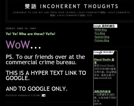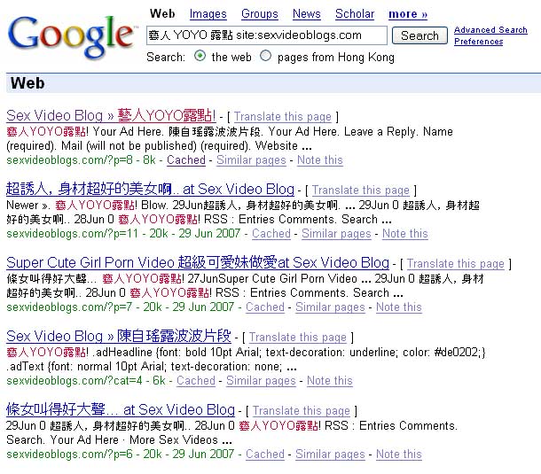 The links lead to a 7-second mobile phone video of a topless female who looks like a certain actress. The common talk is that this is the mysterious Miss A in a court case last year. In that case, a certain construction worker found a mobile telephone on which was this video clip. Miss A had been filmed in a private setting by her boyfriend Mister B. The construction worker attempted to extort HK$50,000 from Miss A but was arrested by the police and successfully prosecuted. Now this video clip has just surfaced on the Internet. First, this video clip is an invasion of the privacy of Miss A and it may also be sealed under a court order. Anyone who uploads the video on the Internet is in contempt of the court. Second, it is definitely indecent material. Third, it is accessible through Google.com.hk. What is the Television and Entertainment Licensing Authority/Obscene Articles Tribunal waiting for? Google.com.hk is registered in Hong Kong and therefore under the jurisdiction of Hong Kong regardless of where it chooses to place its servers. What gives?