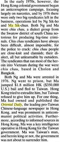 In <The Politics of Heroin>, McCoy cites an article in the now defunct Hongkong Star newspaper based on US Drug Enforcement Administration sources which claimed Ma Sik-yu "was deeply involved with a network that spied on China for Taiwan".