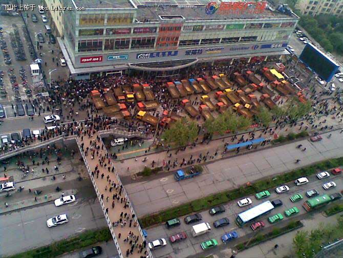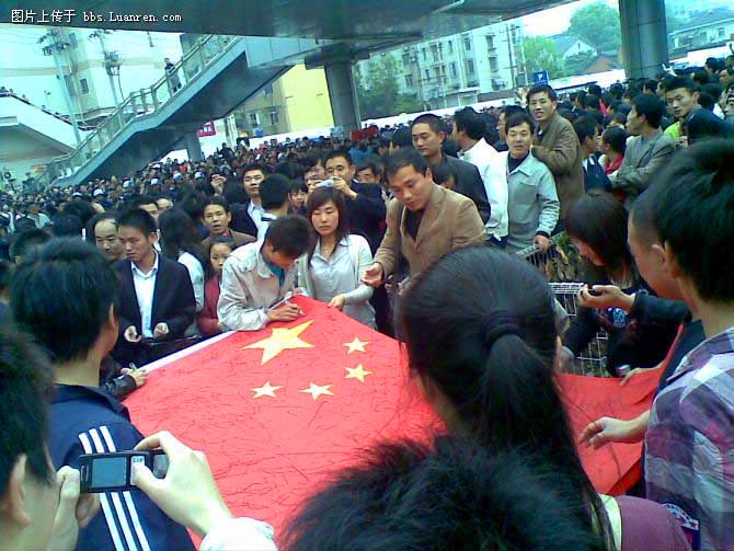 On April 17, more than 200 people showed up at the Carrefour store again.  They used large five-star national flags to block the two entrances and showered looks of contempt upon the citizens who enter and exit the store.  Mr. Song led the slogan-chanting and he was angry at the fact that people were still shopping at Carrefour while they were demonstrating: "They are cold-hearted." That was why he was using the flags to block entry.