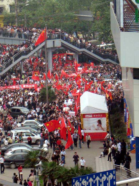 On Aprl 16, a dozen people showed up to protest in front of the Carrefour store in the city of Kunming, Yunnan province.  A citizen named Zhu said aloud, "Why are you boycotting Carrefour?  The majority of the products in Carrefour are Chinese products ... this is irrational." He was immediately denounced as "Nation-betraying traitor!" and then jostled around by the protestors.  Someone even threw a mineral water bottle at him.