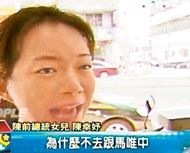Her parents are criminal suspects and her husband is in jail. So the dentist Chen Hsin-yu has been mentally stressed for a while. Earlier the Taiwan media trailed her to the bakery and filmed her going through the red light. Yesterday, Chen Hsin-yu was followed again by the media and she blew her top: "I went through the red light in order to shake off the reporters. You can issue a fine on me. There is no need to follow me around everyday! When I go to buy bread, you follow me! When I went through the red light, I realized that I was entrapped! I made a big mistake! But at that moment, I could not stand it anymore!" "Why did I do wrong? My father is no longer the president! Why don't you follow Ma Wei-chung (note: the eldest daughter of President Ma Ying-jeou) instead?