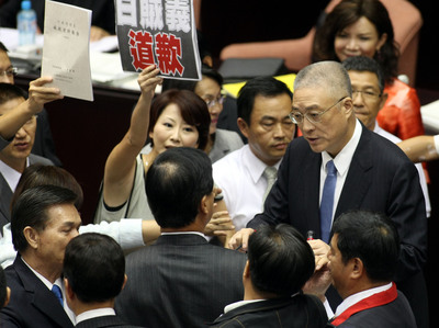 Flanked by DPP lawmakers holding banners that read: “Liar Yih, Apologize,” “Liar premier, how can you rule a country without honesty?” Wu skipped a large portion of his 15-page statement, polishing it off in just 10 minutes.