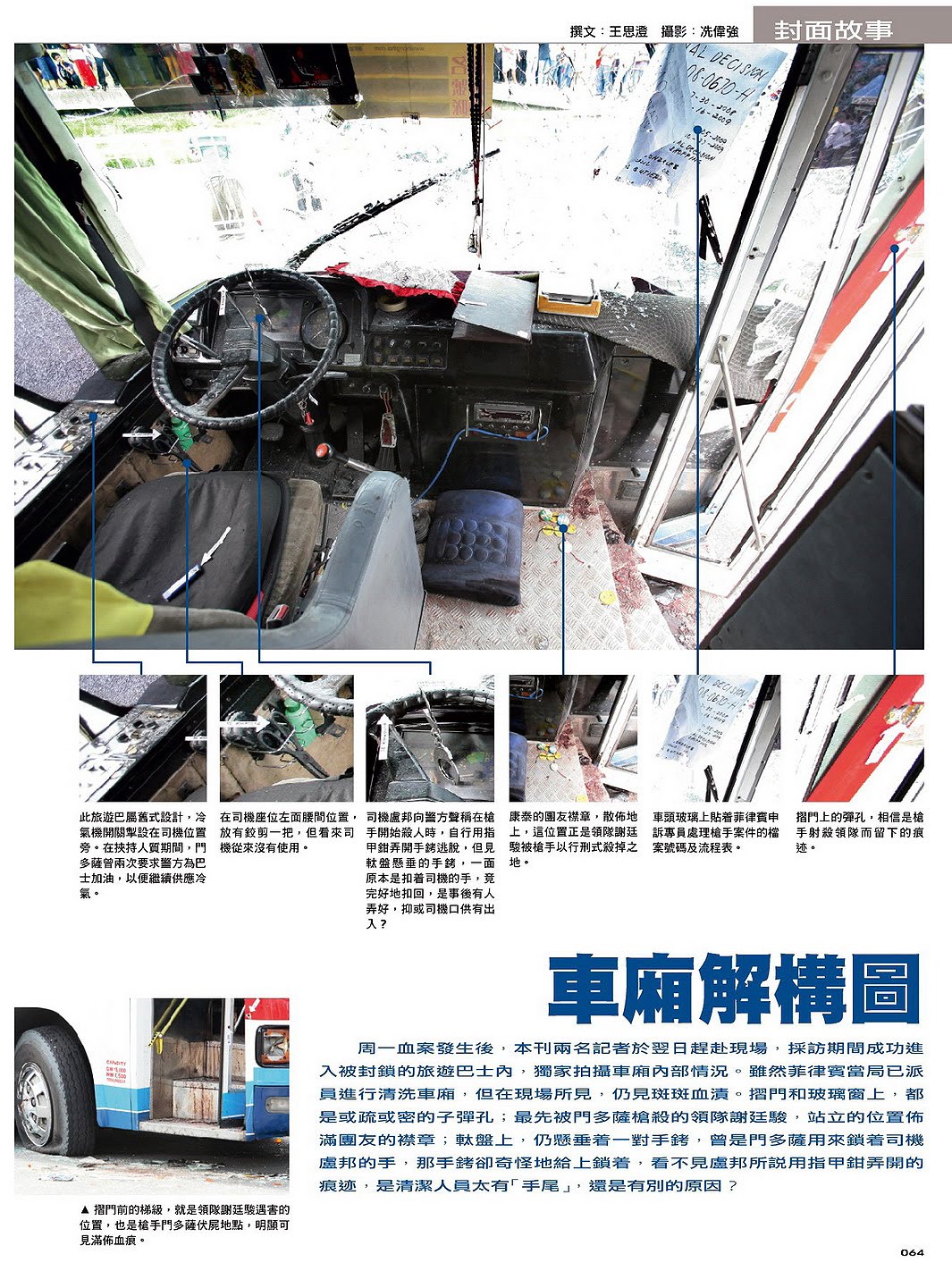 We arrived at the government hospital, where the facilities were also sparing. We were then moved to a better hospital. Various government officials, emergency department people and consulate representatives kept asking us why the gunman suddenly went crazy and opened fire. I got mad and I cursed them out, Did they really want to rescue us? How could it take so long to rescue people? Why didn't the police seize the opportunity to attack the gunman when he showed himself in public? Why didn't they meet the gunman's demands and free the hostages first? ... Mr. Chan kept trying to find information about his girlfriend Ms. Yee. But there was no way because it was chaos at the hospital. Mrs. Leung tried to find her children. It was heart-breaking to see her tear-covered eyes. She looked ready to collapse any moment. I took care of my crying, terrified mother on one side while holding Mrs. Leung's hand in my other hand. She and I repeatedly asked the government officials present to take her to see her children. But these incompetent government said that they had no idea which hospital her children were at ...