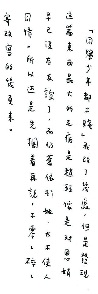相关文献其实就是张爱玲写给我爸爸的信。小说有什么毛病呢?她1978年5月26日的信就有答案:《同学少年都不贱》我改了几处,但是发现这篇东西最大的毛病是赵珏像是对恩娟早已没有友谊了,而仍旧依赖她,太不使人同情。所以还是先搁着再说,不零零碎碎寄改写的几页来。就是这样简单,她其实只打算改写几页。